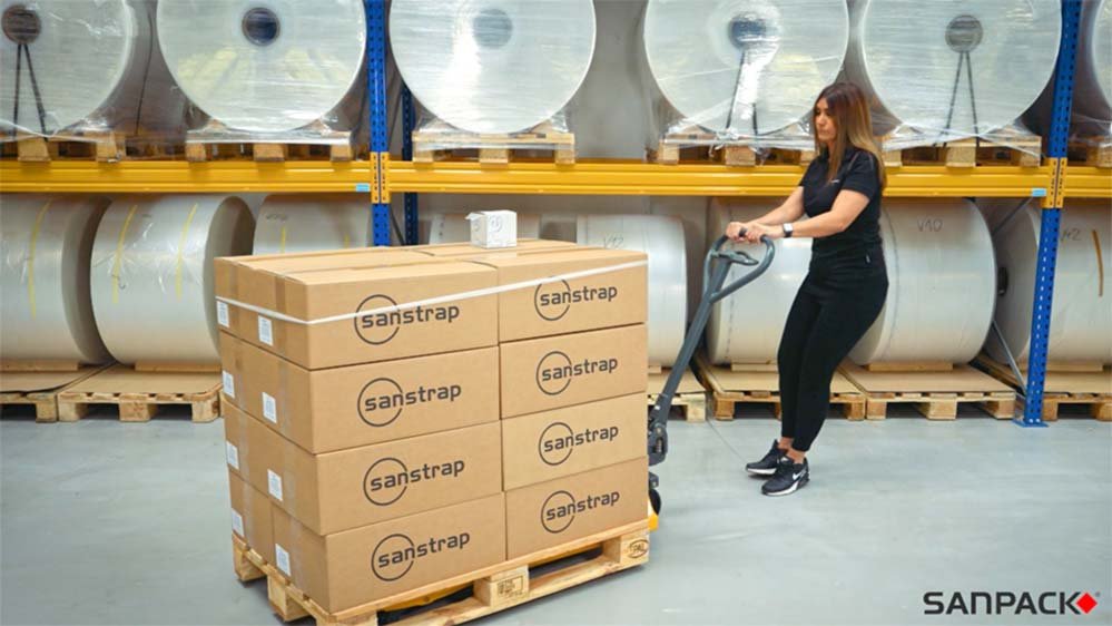 Wenn es sich um instabilere Waren wie lose Kartons handelt, empfehlen wir zusätzlich eine Antirutschfolie (z. B. sangrip®) zwischen den Lagen. So verrutscht nichts, und die benötigte Bandanzahl kann gering gehalten werden.